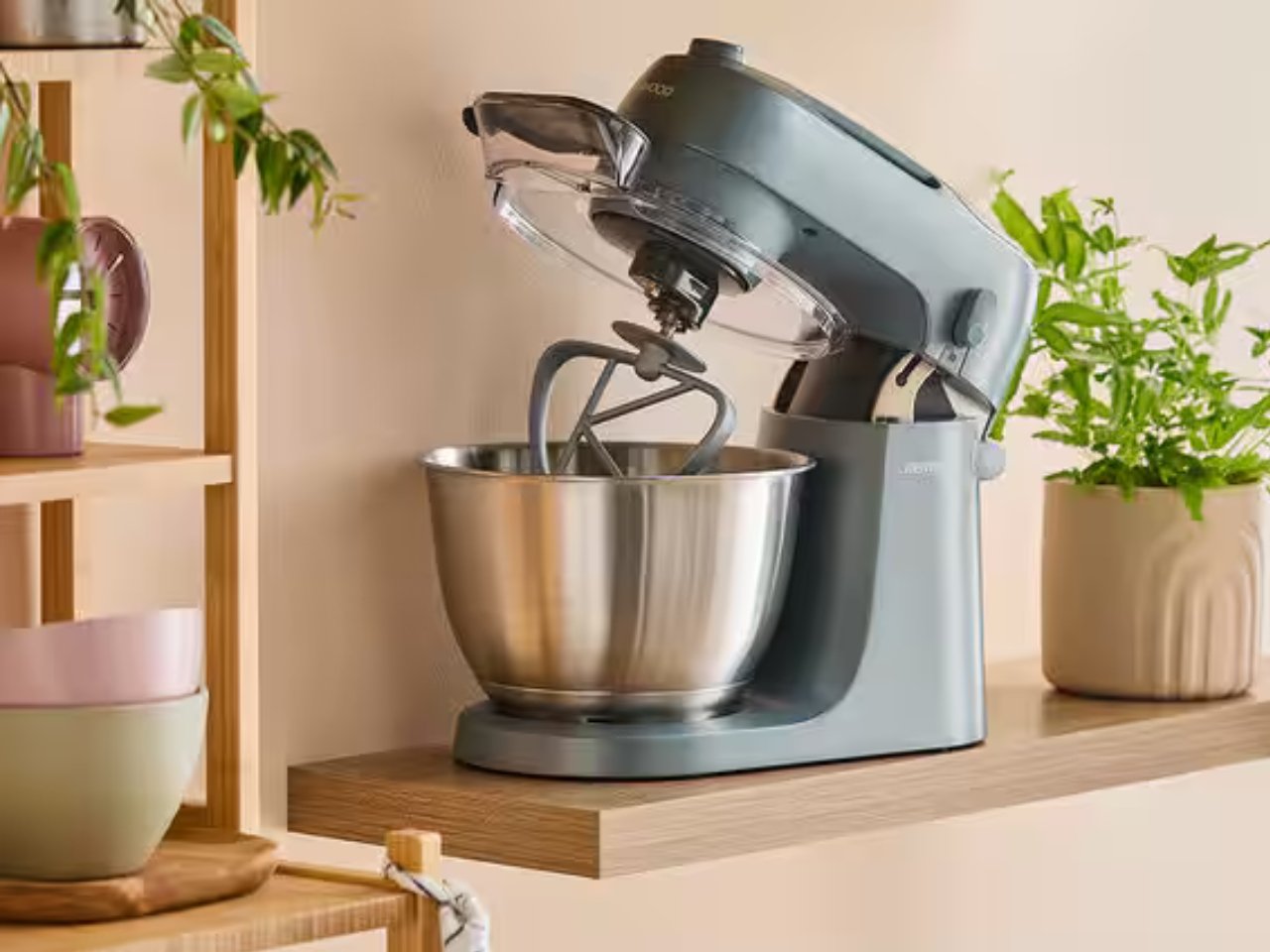 The mixer’s clean lines, rounded forms, and muted color options (like Storm Blue and Clay Red) make it as attractive as it is functional. It easily blends into contemporary kitchen aesthetics, elevating both form and function. It has intuitive controls as well and its simple, user-friendly dials allow for effortless speed adjustment. The included splash guard features a unique rotating mechanism, offering both safety and ease of use. It also comes with a compact mixing bowl and essential accessories for whipping, mixing, and kneading. The thoughtfully integrated tools like a measuring spoon on the splash guard help streamline the prep process.