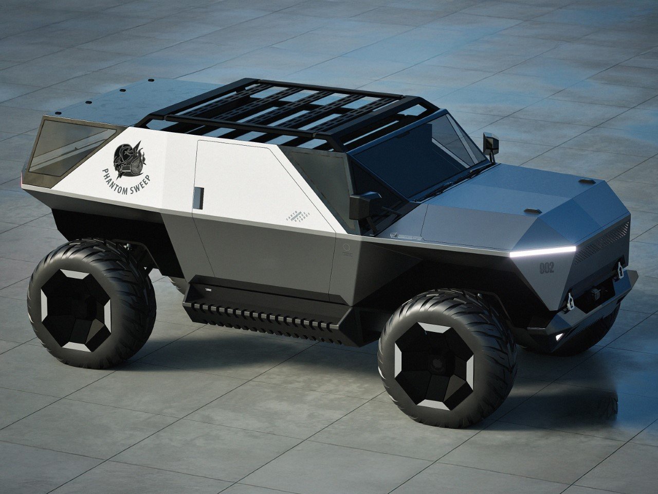 I appreciate the subtle details, too. The integrated light bar on the front bumper, the roof rack that looks like it was salvaged from a Mad Max set, and the “Phantom Sweep” logo on the side panel, they all contribute to the Cyber Tonka’s distinct personality. This concept feels like a vehicle designed for a world where roads are optional, and survival is paramount.
